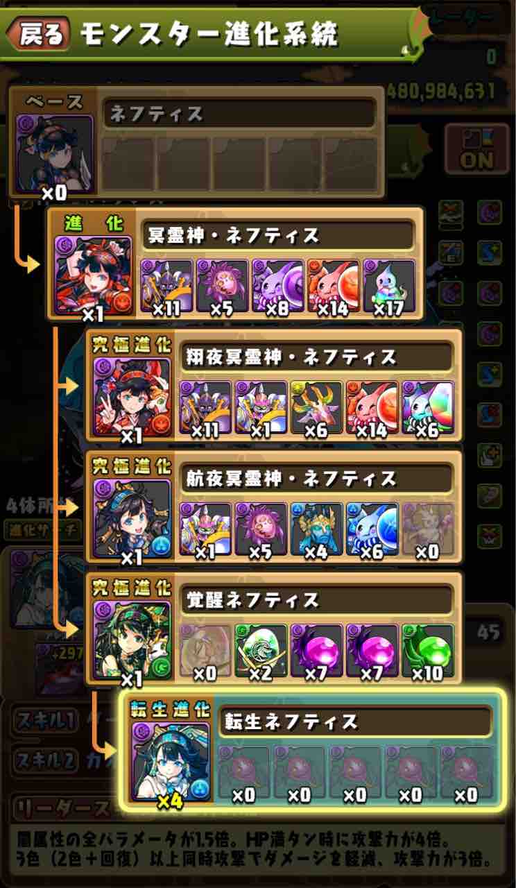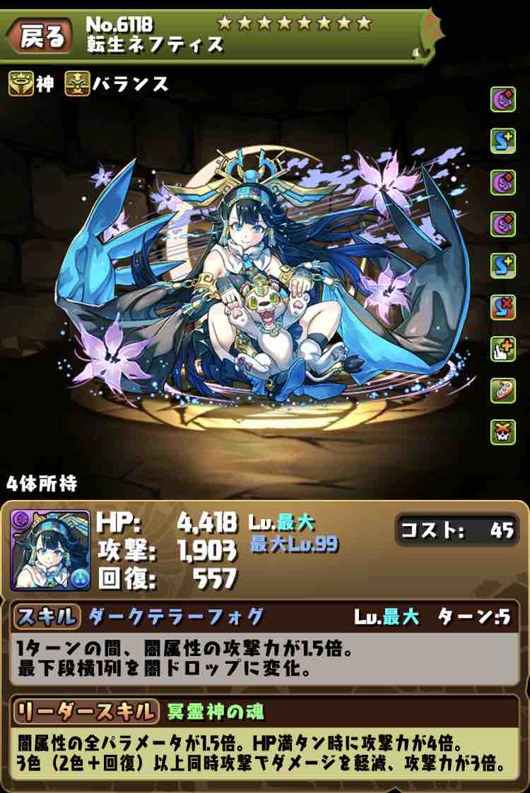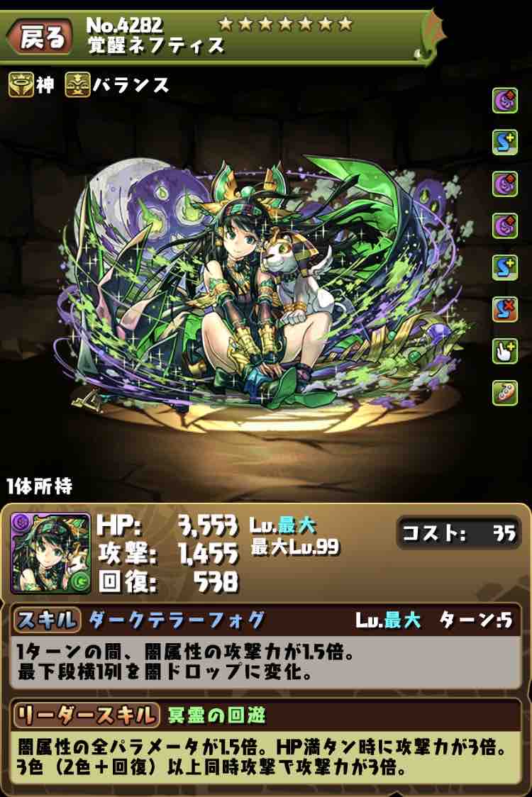 覚醒ネフティスになると、当時の新ドロップのコンボドロップ(えだまめ)を持った列強化キャラとして「覚醒がね。。。スキルも重いよね。。リーダースキル。。うーん。。。微妙!!!初心者向けだね。」と何度言われたか分からないほど、当時強化や実装された覚醒を渡されてきたネフティス…